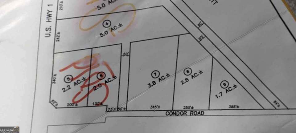 Lot 7, 8, and 9 - 8.3 Acres. Corner of US-1 and Condor Rd. This listing is for LOTS 7, 8, and 9 ONLY. These 3 lots must sell as one transaction. Seller will consider selling lots 8, 9 as one transaction. See other listing for Lot 5. All other lots are not available. Property has NO restrictions, NO covenants, NO deed restrictions. Mobile homes are welcome. Bring all CASH offers. Property is at the corner of US-1 and Condor Rd.