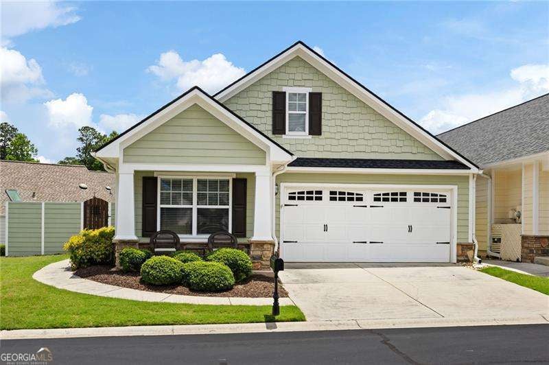 Estate home sale in popular Montclair at Ridgewalk! Stepless 2 bedroom, 2 bath ranch home on a corner lot! Relax with coffee on the front porch or take advantage of the fenced in courtyard providing extra green space beyond patio adding to outdoor enjoyment and entertaining! Natural light in this beautiful home features an open floor plan with vaulted ceilings, skylight, and recessed lighting. Hardwood floors in the foyer, great room, dining, & kitchen areas. Spacious kitchen includes abundant stained cabinetry, stone countertops, skylight, breakfast bar, stainless steel appliances, gas stove, refrigerator, microwave, & pantry. Vaulted master bedroom suite, with walk in closet, double vanity, & large tile shower! The kitchen, great room w/frpl, and dining area face a wall of windows overlooking the fenced-in courtyard! The secondary bedroom is serviced with a full bath with tub/shower combo and tile floor. Two car garage with opener. Plenty of floored storage in the attic above the garage. This complex has an active HOA and the homeowners utilize the community clubhouse for meetings & activities plus includes a fitness center. Montlcair is ideally located across from & within walking distance to the The Outlet Shoppes at Atlanta and so close to vibrant downtown Woodstock! Quick access to I-575. This complex is not age restricted.