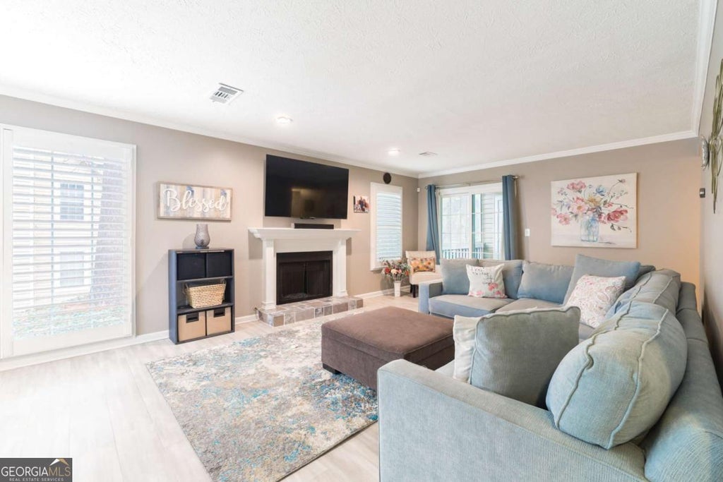 Convenient to I-75/I-285, this updated condo with a spacious two-bedroom floorplan is top notch. Unit 1301's foyer greets you. To your left, you'll find a big, bright living space with a fireplace and several large windows with green views. To the right, you'll find ample dining/kitchen space (laundry hidden in kitchen). Don't miss the two covered patios with premium storage, accessible from the living, dining and both bedrooms. The primary bedroom has a custom walk-in closet and ensuite bath with an extra storage room. A secondary bedroom is well-sized and has direct access to the second bath, also accessible from the hall. Great flow minutes from Atlanta proper. Community swim, tennis + more. Minutes from Truist Park and all the Battery has to offer!