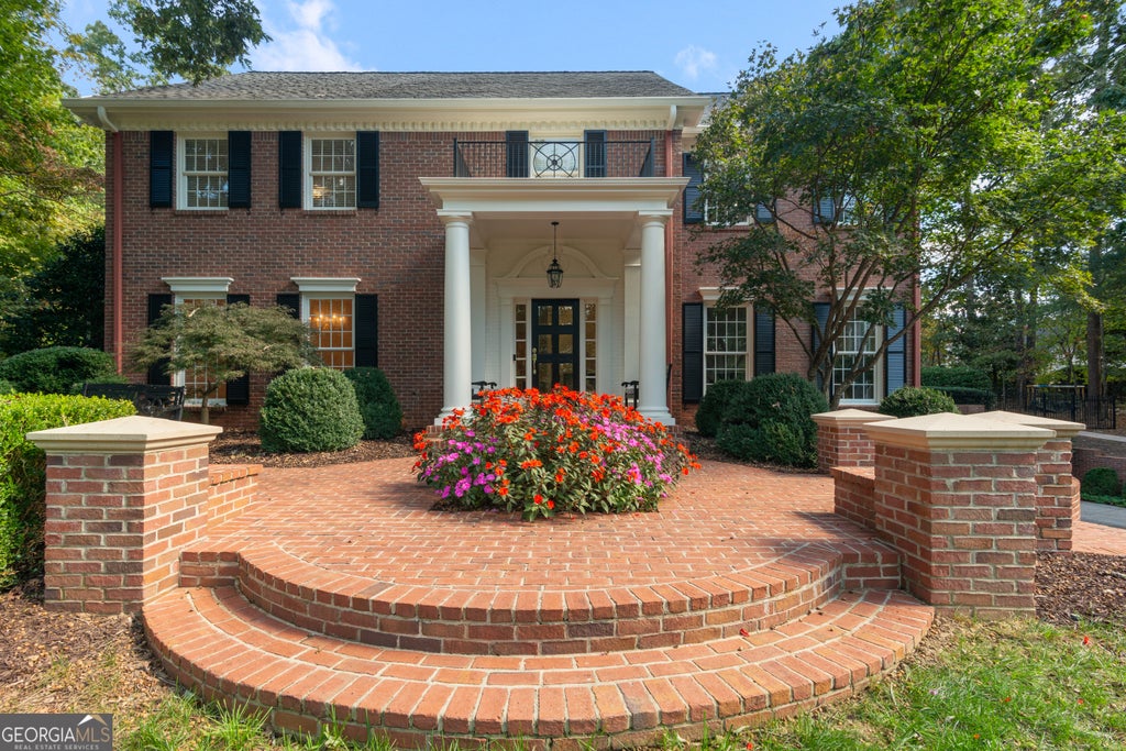 Southern classic all-brick residence sits gracefully above grade on an acre-plus lot in one of Sandy Springs' most admired neighborhoods-River Gate. The setting offers timeless curb appeal, featuring a brick courtyard entry and columned front porch leading into a grand two-story foyer. Inside, the main level showcases 9' ceilings and beautiful hardwood floors throughout. The formal dining room is generously sized-ideal for hosting gatherings-while the living room is bright and inviting, centered around a fireplace and picture windows. The kitchen is the heart of the home, designed for both function and entertaining. Features include a large center island, updated cabinetry, granite countertops, a farmhouse sink, and high-end stainless steel appliances, including a gourmet gas range and built-in oversized refrigerator. Pendant lighting adds a modern touch. A secondary cocktail/rinse sink, pantry, and cozy fireside den/keeping room complete the space. The kitchen opens to a light-filled sunroom with a cathedral ceiling and direct access to the patio and pool area. Nearby, a large laundry room includes a sink, storage cabinets, and space for organization. A covered side patio with an awning provides the perfect spot for grilling or casual dining. Upstairs, the primary suite is spacious and serene, featuring a walk-in closet with custom built-ins and a luxurious bath with double vanities, whirlpool tub, separate shower, and travertine flooring. Three additional bedrooms complete the upper level-two sharing a jack-and-jill bath, and one with its own private ensuite bath. The terrace level provides abundant flexible space, including a large recreation room with billiards area, an adjacent office or exercise room behind French doors, and a half bath. A true highlight is the oversized garage, offering far more room than a typical two-car setup-ample space for multiple vehicles plus a full workshop or hobby area, or generous storage capacity. The high ceilings further enhance functionality and versatility. Outdoor living is a highlight of this property. The sunroom with vaulted ceiling opens to an in-ground saltwater pool and spa with waterfall feature, surrounded by extensive stone hardscaping and lush, professionally designed landscaping. The deep, fenced backyard includes a level lawn, a former play area perfect for a garden, and a storage shed for tools and equipment. A smaller private deck offers another quiet retreat. Located just minutes from top schools, shopping, dining, and Dunwoody Country Club, this home blends traditional elegance with modern comfort in one of North Atlanta's most desirable settings.