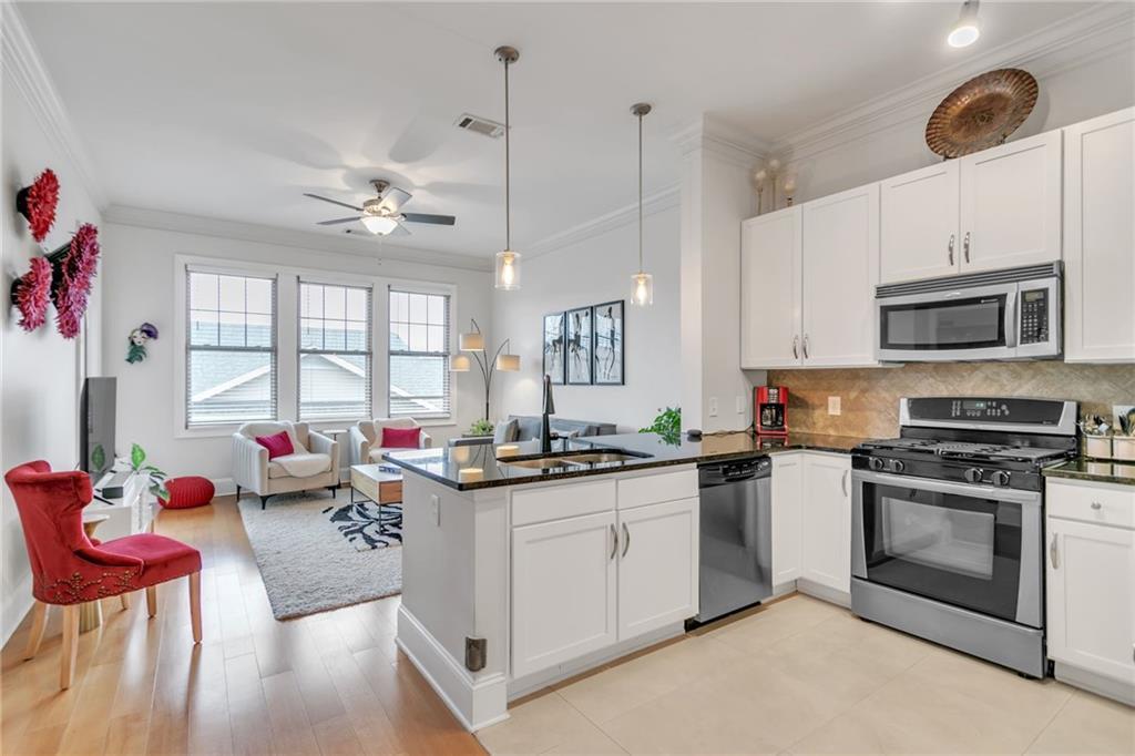 TOP FLOOR bright South Facing home, quiet one of a kind condo in an unmatched location in the complex > A new HVAC system, new hot water heater, refinished cabinets in the kitchen and bath plus the installation of a large walk-in shower add over $20,000 in upgrades > Easy one level living with soaring 10 foot ceilings and expansive windows > This unit has lowest monthly HOA in complex > Parking options are super-convenient to this home’s location > Complex fully replaced roof in 2024 > Amenities include: renovated pebble tech resort style pool with outdoor grilling area, club room with catering kitchen, modern fitness center, guest suite, concierge services and on-site management. Cobb County taxes are another plus in this Historic Vinings Village move-in ready home.