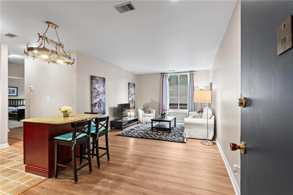 Charming and renovated two-bedroom Midtown condo for an amazing price! You’ll be mesmerized by the open floorplan, ideal for entertaining. The chef’s kitchen boasts high-grade cabinetry with stainless steel appliances and has been opened up to the living area. Kitchen island breakfast bar is the perfect spot for morning coffee! Large gathering space could easily accommodate a dining table if so desired. Pretty paint colors and neutral (newer!) flooring throughout set the stage for any decor style. Updated bathroom boasting granite countertops and a connected powder bath, ideal for visiting guests or roommates sharing the space. Large primary bedroom with sizable walk-in closet offers laundry hook-ups, a rare find in this building! This cool midcentury building is well-built with quiet neighbors, updated corridors, and two levels of gated parking. Biggest perk of all has to be the jaw-dropping views from the shared rooftop terrace! Amazing Midtown location is steps from iconic hot spots like the High Museum of Art, Colony Square mixed-use development, and everyone’s favorite - Piedmont Park! You won’t find a better deal in all of Midtown so you better act fast. Welcome home to 1421 Peachtree Unit 211, where life is good and living is easy!