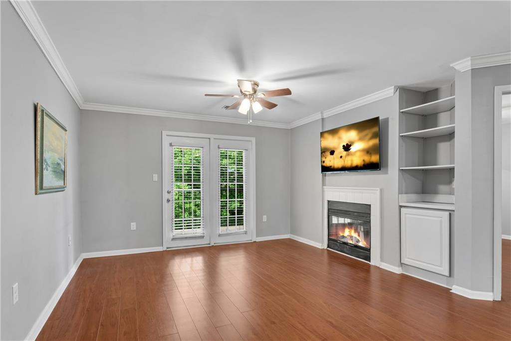 Smooth ceilings and wide plank hardwood flooring throughout! White granite kitchen w/SS appliances and tile backsplash. Fridge, Washer & Dryer all included. Open concept dining room views living room w/wood burning fireplace and built-in bookcase. Crown molding in main living areas. French doors lead out to HUGE covered balcony. 2" blinds. Primary suite w/fireplace, built-in granite dressing vanity or home office nook, linen closet and custom walk-in closet. Tile bath with granite vanity. Laundry is NOT a stack unit - true laundry area with both units on the floor. One deeded and securely gated parking spot included. Community includes swimming pool and fitness center!