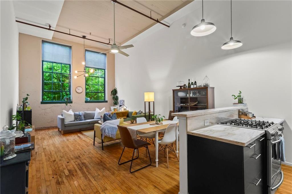 Lofty goals become a reality at this rare two-story unit in the desirable Brushworks building! On the main level, the open concept floorplan is perfect for entertaining a crowd or sharing an intimate evening with a loved one. Soaring 14’ ceilings, stunning hardwood floors, and the original (working!) iron windows impress all who enter. The large gathering area is comfortably sized for a dining space and living room with an array of layout options. At home chefs will delight in this gourmet kitchen boasting stone countertops, stainless steel appliances, and open shelving. Seller is leaving the perfectly sized pantry which houses the microwave and clutch extra storage. Around the corner, the utility room offers even more storage (rare in a loft!) and a large laundry zone to make the inevitable chore a bit more manageable. Head downstairs to the private quarters, nicely separated from the social spaces. The largest bedroom, currently used as an office, features classic brick walls and insulated windows. Two closets and a unique curved wall define the secondary bedroom. Full bathroom is a cute spot with trendy sink and room for free-standing linen storage. The polished concrete floors and beamed ceilings are both architectural wonders on this lower floor! This 1940’s building boasts secured access, gorgeous hallways and shared spaces, plus a community rooftop perfect for enjoying the skyline views with friends and neighbors alike. Amazing nightlife and posh local dining options are moments away on Edgewood Avenue plus an Atlanta Streetcar stop is just outside the community! Short jaunt to the Eastside Beltline Trail for even more destinations and shenanigans. On weekends when you leave the cars behind, the two assigned spots in the gated parking lot are a welcome perk! Don’t miss the approved FHA financing option with typically more desirable interest rates. Welcome home to Unit 13 at Brushworks Lofts, where life is good and living is easy!