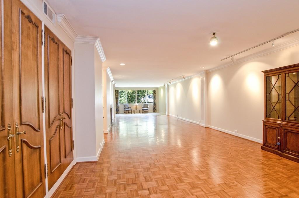 Best value on the "golden mile" of Buckhead. The largest condominium in the Peachtree Andrews complex, this unit is vacant and ready for your updates.9' ceilings, hardwood floors and gas fireplace, this large open floor plan runs from the open kitchen, dining area and fireside living room all the way to the large picture window overlooking neighboring Tarrymore. So many ways to use this space. Enter in to a long gallery style hallway with two walk in closets and shelving perfect for hanging art or showing off collectibles. Tremendous primary suite with his/her closets/ bath/ sitting room and glassed in small porch with windows to the exterior. Guest bedroom/walk in closets with hall bath. Large separate den with wall of built in bookshelves and closet could serve as a third bedroom if desired. Unlike other units, this unit is complete with a powder room, laundry room and four walk in closets in the public areas great for storage. The dining area also has 3 built in china closets for additional storage. If you are looking for a large open plan in Buckhead's best location, look no further. This is the best value in town. 2 gated assigned parking spaces and one storage unit. One pet not to exceed 25 lbs.
