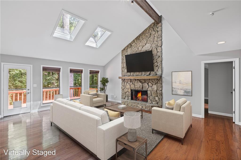 GREAT NEW PRICE!!Escape the hustle and bustle of East Cobb nestled in your own private wooded retreat located at the end of a cul de sac. This very spacious 4 bedroom 3.5 bath home located in East Cobb's coveted trifecta of schools is now available for immediate occupancy. Spacious Eat in Kitchen has been renovated with up to date style and large island topped with all stone counters, deep sink, modern faucet, stainless steel appliances and range hood all top hardwood flooring. Incredible great room with vaulted ceilings floor to ceiling fireplace and abundant windows and skylights contribute to the open and airy contemporary feel. Hard to find primary ensuite on main level includes fireplace, hard woods and plenty of room for separate seating area surrounding the fireplace. Primary bath has a complete renovation with deep soaking tub separate tiled shower and dual vanities. Head upstairs where you find 2 generous sized bedrooms connected by shared bath in addition to a versatile windowed loft area on the opposite end of the 2nd floor. The terrace level continues with generous rooms and has a great family room and 3rd fireplace and wet bar too.Loads of space for all the your recreation fun. Additional 4th bedroom with adjacent full bath provides multiple options for use such as a home office, gym or guest room. Multiple access across 2 levels of the home to wrap around decking provides wonderful views of your large private lot and also provides plenty of space for entertaining. Newer roof, HVAC and water heater are just a few recent improvements. Home has just been refreshed with paint and all newly installed carpet. Driveway Retaining wall replaced just this month Garage has been outfitted for EV charging. Rentals allowed making this a great property for investors. Make your move and enjoy the full amenities the community provides for the whole family!