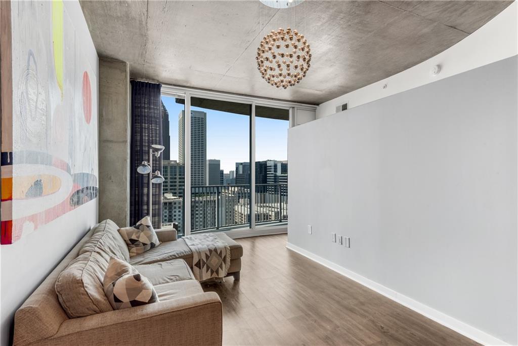 BEST DEAL IN SPIRE - GOOD SQ FT, HIGH FLOOR LEVEL AND MOVE-IN READY!! Sunny unobstructed southern views of Downtown from the 18th floor of Spire! Updated luxury vinyl flooring through-out in stylish color. Well thought out plan features plenty of space for a dining table outside the living room area. 10' exposed concrete ceilings. Built-in desk area off the kitchen could also be used for a bar area or drop zone. Floor to ceiling windows leaded to the covered balcony. One of the larger bedrooms for the 1 bedroom plans at Spire leaves plenty of space even with a King sized bed! Tile bath w/garden tub/tile shower combo. One deeded covered parking spot in the gated parking garage. Spire features 24 hour concierge, club room, swimming pool, grilling area & fitness center. Walkable to restaurants, Fox Theater, GT, Piedmont Park and more!