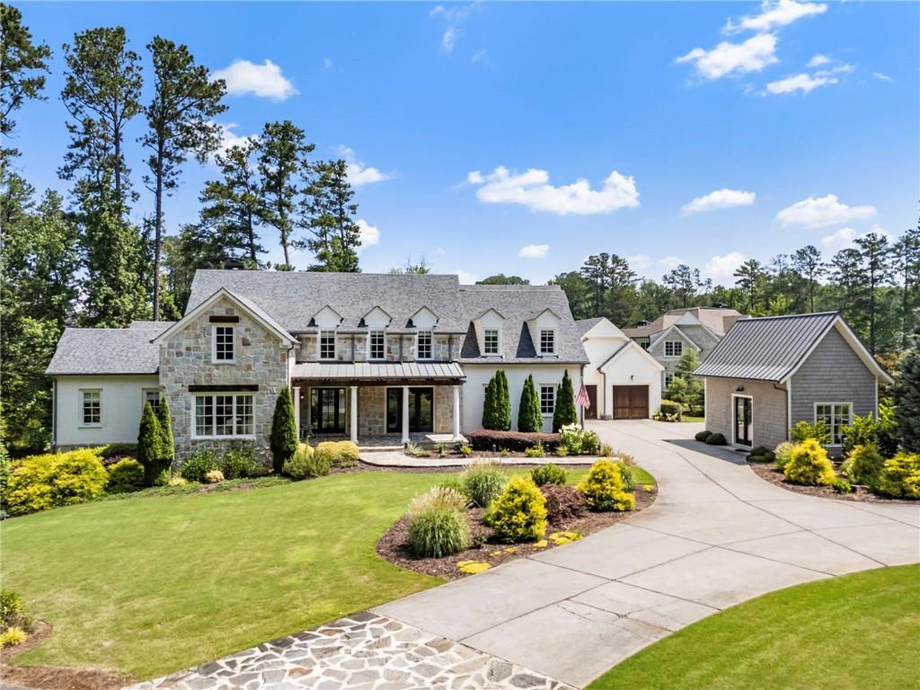 Welcome to this extraordinary English farmhouse-style estate by Harrison Design, nestled within the exclusive 10-home gated enclave of Bentwater Estates. Perfectly positioned on 2.49 acres, this stunning residence overlooks a private, fully stocked 4-acre lake, offering tranquil water views, wooded privacy, and access to scenic walking paths. The home’s exterior showcases timeless craftsmanship, featuring four-sided brick, premium stonework, and beautiful covered front and back porches.