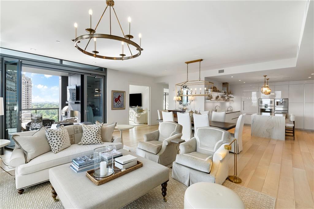 Perched on the 14th floor of The Charles-Buckhead's premier boutique high-rise-this exquisitely customized residence exemplifies the pinnacle of elevated city living. Every inch of the home has been thoughtfully tailored by the current owners, blending refined materials with cutting-edge functionality and unobstructed views of the Midtown and Downtown skylines. The open-concept floor plan encompasses two bedrooms, two full bathrooms, one half bath, and a separate den ideal for a study, library, or secondary living space. The interiors are anchored by 8-inch wide-plank hardwood floors and punctuated by high-end design selections including Circa Lighting fixtures, custom air vent covers, and pocket doors throughout. The kitchen and bar are appointed with White Mountain quartzite countertops, Waterworks faucets, and a built-in Gaggenau espresso system. Automated shades and integrated speakers, controlled by a full-home smart system, elevate the experience of everyday living. A seamless connection to the outdoors is achieved through a retractable NanoWall system, complete with custom screens, opening to a covered fireside veranda-- an ideal vantage point for sunsets over the city. The primary suite is a true sanctuary, featuring heated floors in both the bath and closet, a steam shower, Toto Neorest toilet, and a Waterworks heated towel bar. A temperature-controlled, deeded storage unit is conveniently located on the same floor, offering an additional layer of everyday ease. The Charles delivers a curated lifestyle experience with 24-hour concierge, valet, resort-style infinity pool, club room with catering kitchen, pet walk, fire pit, fitness center, and an onsite guest suite. Located in the heart of the Shops of Buckhead, the city's finest boutiques and restaurants are steps from your front door.