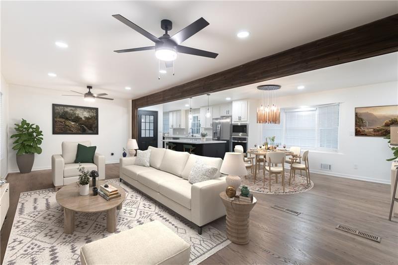 WOW! 50k price improvement!!! This stunning remodeled ranch FUNCTIONS AS A 5 BEDROOM HOME. 3 BEDRDOOMS PLUS 2 BONUS ROOMS WITH CLOSETS for a possible 4th and 5th bedroom or office/hobby space. Every inch of this home has been lovingly remodeled, combining timeless craftsmanship with bold, modern farmhouse flair. Beneath your feet, real oak hardwoods stretch across the entire home, stained in a rich dark walnut that grounds each room with warmth and elegance. Look up and you’ll see statement lighting—gorgeous pendants, dazzling chandeliers, and matte black remote-controlled ceiling fans that bring comfort and style together. Soft dimmers create the perfect ambiance, while faux wood blinds filter in golden afternoon light. The heart of the home—the kitchen—was designed to inspire. High-level quartz countertops, Zellige tile backsplash, exposed brick, a chef’s sink and industrial-style faucet, and gleaming stainless steel appliances make this a space where form meets function beautifully. Each of the three full bathrooms is its own retreat, brimming with custom touches, luxurious tile work, and curated finishes that feel both fresh and timeless. Every closet has been reimagined with custom inserts—organization made effortless. But the magic doesn’t stop upstairs. Venture down to the expansive 1,200 sq ft walk-out basement, and you'll find a world of possibilities. With a full second kitchen—complete with fridge, range, dishwasher, micro cement counters, and matte black cabinets—it’s ideal for hosting, rental income, or a cozy in-law suite. The retro-styled curved bar, custom shelving, and a chalkboard wall ready for game night add charm and character that invites good times. Recessed lighting flows throughout, creating continuity and calm from floor to floor. The basement bathroom? A nod to classic design with subway and penny tile, blending nostalgia with fresh style. Set on a generous lot with a spacious back patio perfect for entertaining or unwinding, this home is more than a place to live—it’s a place to thrive, host, and grow. This is not just a remodel. It’s a story of vision, care, and exceptional design. And now, it’s ready for its next chapter—with you.