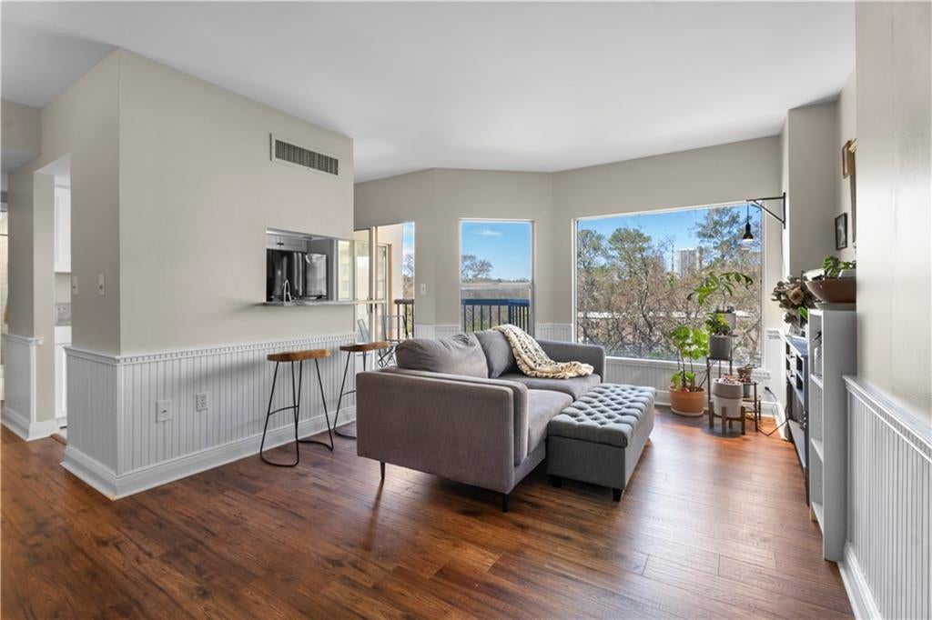 RARE 2 Bedroom 2 Bath unit in this amazing building with incredible amenities! Located on second level, this home has the most wonderful natural light! The open floor plan welcomes you with wall of windows out the Living Room and Kitchen with Dining Area convenient to both spaces! Beautiful trim details help to warm the space. Kitchen provides great storage with stone countertops and white cabinets! Primary Bedroom is also light-filled with walk-in closet and gorgeous updated Bathroom! Secondary Bedroom would be ideal for roommate plan or use as a home office as it is currently! The secondary Bathroom has also been completely remodeled! Laundry closet located in the hallway. The spacious balcony is accessible from the main Living Room or Primary Bedroom and provides great flow for entertaining or just relaxing! Be sure to check out the Fitness Center and Pool with all of this located in ideal Buckhead location!