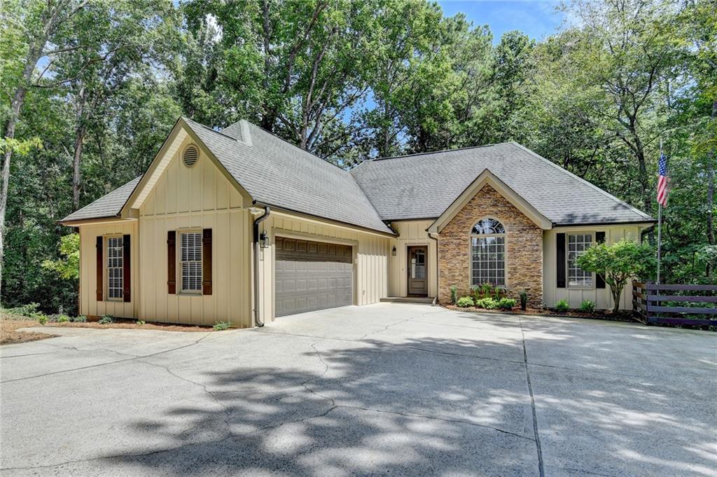 Gorgeous UPDATED 5 bed/3 bath RANCH home with FINISHED TERRACE LEVEL and FULL IN-LAW SUITE on a 1-ACRE, beautifully landscaped, very private, wooded lot! Terrific curb appeal with stone work and recently added BATTEN BOARD SIDING on the front of the home! Enter through the foyer and into the warm and inviting FAMILY ROOM, with its stunning stack STONE FIREPLACE, vaulted ceiling and door to the expansive UPPER DECK with steps LEADING to the LOWER DECK. Enjoy meals in the perfectly sized DINING ROOM with views of the tranquil, wooded backyard! The kitchen has been beautifully UPDATED! It features stone countertops, stainless steel appliances and an island with modern BUTCHER BLOCK COUNTERTOP and a double sink. Thoughtful details like BATTEN BOARD ACCENTS in the MUDROOM/SITTING AREA and a LAUNDRY CLOSET with room for a pantry and a BARN DOOR add character. The spacious MASTER SUITE features a grand VAULTED ceiling and SITTING AREA and a spa bath with vaulted ceiling, ample cabinetry, tile floor and shower, double vanity with modern BUTCHER BLOCK COUNTERTOPS, WHIRLPOOL tub and large WALK-IN CLOSET. 2 additional bedrooms on main floor with WALK-IN CLOSETS and a full bathroom with vaulted ceiling, butcher block countertop, shower/tub and tiled backsplash complete the main level. The finished daylight TERRACE LEVEL provides a COMPLETE IN-LAW/TEEN SUITE! It features a complete KITCHEN with full SIZED RANGE, double sink and dishwasher. This expansive space also features an open plan LIVING SPACE, 2 LARGE BEDROOMS with closets, a full BATHROOM with tub/shower and cabinetry, WASHER/DRYER hookups, plus a 3RD GARAGE and HUGE WORKSHOP—ideal for MULTIGENERATIONAL LIVING, a TEEN SUITE or extended stays. A side-entry from the terrace level opens to a private OUTDOOR LIVING AREA with PEBBLE-STONE PATIO and removable FIREPIT, perfect for entertaining or relaxing or as a play area. Surrounded by mature trees and beautiful landscaping for a wooded backdrop and exceptional privacy. Convenient steps lead up to the front of the home providing a SEPARATE TERRACE LEVEL ENTRY. Extensive updates include new LVP FLOORING, FRESH PAINT throughout, new LIGHT FIXTURES, new HVAC system, new FURNACE, new landscaping and new craftsman-style Hardi board front siding. This beautifully updated ranch home offers the perfect blend of modern upgrades and peaceful living and no HOA restrictions. Located in the TOP-RATED FORSYTH COUNTY SCHOOLS district! Minutes from Publix and just 10 minutes to GA-400, Walmart, numerous restaurants and shopping, it offers convenience and tranquility…The perfect place to call home!