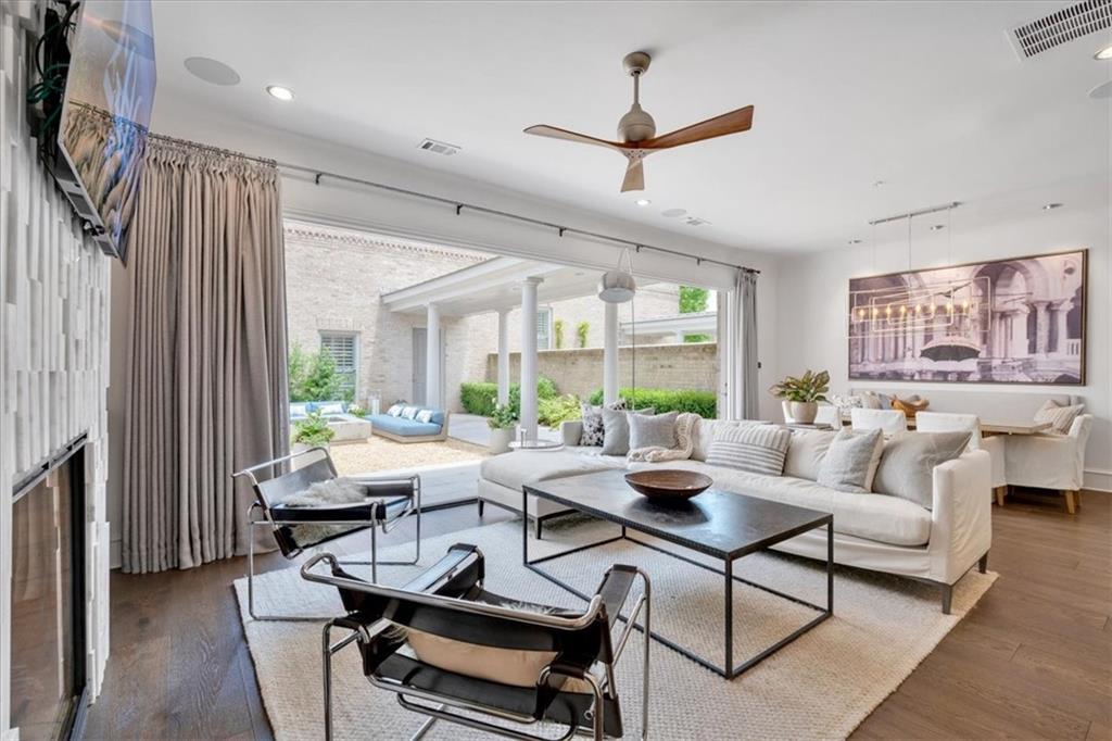 This stunning home boasts 4 spacious bedrooms and 5 luxurious bathrooms. The open-concept main floor features a chef’s kitchen with top-of-the-line appliances, including a Wolf microwave and coffee station, Sub-Zero refrigerator/freezer and wine fridge, and Monogram gas range and dishwasher. The kitchen seamlessly flows into the living and dining areas, enhanced by spectacular Nana accordion doors that open to a recently renovated courtyard with approximately 900 sq. ft. of rare, private outdoor space. Here, you’ll find an outdoor Napoleon built-in grill, gas fireplace, accent lighting, automatic irrigation, a water feature, and advanced drainage—perfect for entertaining or serene relaxation.