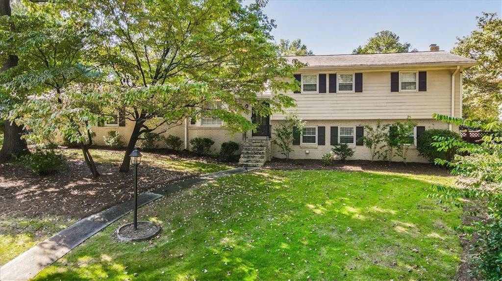 Split-level brick home on half-acre corner lot. 5 bedrooms (4 bedrooms + office), 3 fully updated bathrooms. Multiple living areas include formal living, den with decorative fireplace, and music/piano room. Kitchen with custom wood cabinetry, granite counters, and stainless steel appliances.