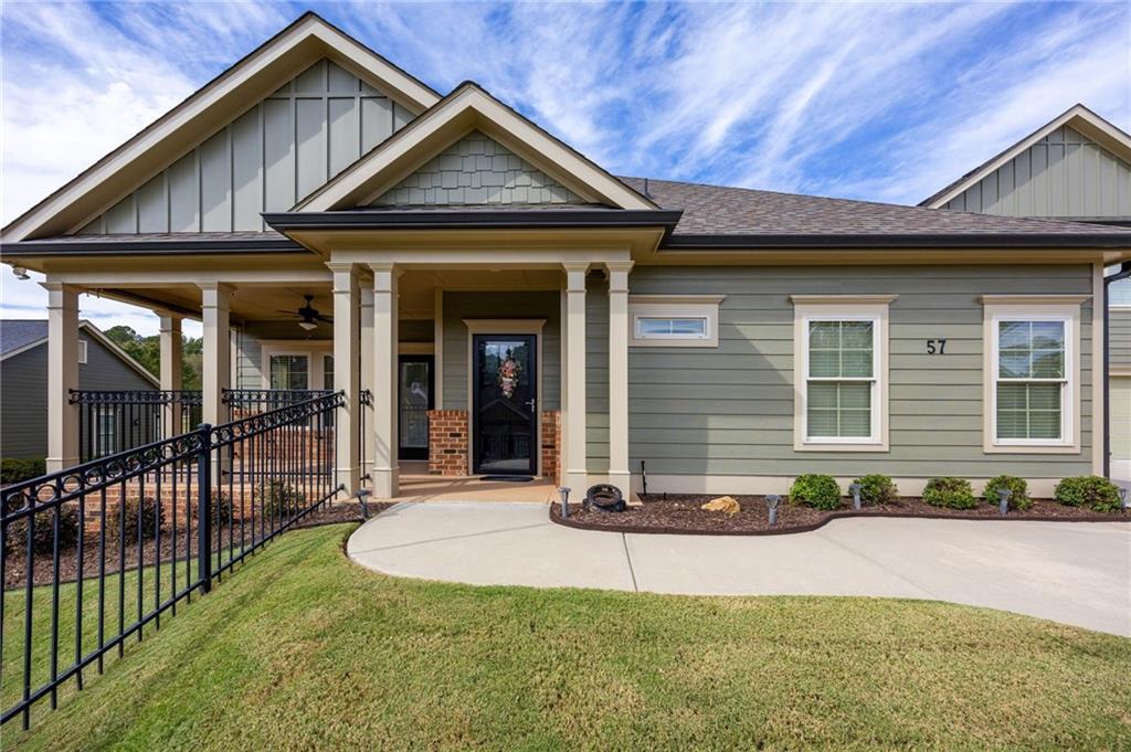 Welcome to 57 Cedarcrest Village Lane, a beautifully appointed home in the sought-after Cedarcrest Village active adult community. This residence combines thoughtful design, timeless finishes, and a prime location near neighborhood amenities. Step onto the inviting covered front porch with epoxy flooring and sunshades—perfect for morning coffee or evening relaxation. Inside, the home greets you with high ceilings, crown molding, and rich hardwood floors that extend throughout the main living areas, creating a warm and open atmosphere. A cozy remote-controlled gas fireplace anchors the open-concept great room that flows seamlessly into the dining area, highlighted by an elegant coffered ceiling. The gourmet kitchen is designed for both everyday living and entertaining, featuring a large center island with a breakfast bar, granite countertops, gallery stainless steel appliances, and a large pantry. The primary suite is a true retreat, featuring a tray ceiling, a luxurious ensuite bath complete with a double vanity and a stepless tile shower with a bench, as well as a spacious walk-in closet with a convenient pass-through to the laundry room. A guest bedroom or home office with access to a full bathroom completes the main level. Upstairs, a versatile flex room with its own full private bathroom offers endless possibilities—whether as a third bedroom, media room, or craft space. Additional highlights include a large walk-in floored attic and two-car garage with epoxy flooring and storage. Close walk to the community clubhouse, which features a lounge, fitness center, catering kitchen, and library. Bentwater Golf Club, Acworth Health Park, shopping, and dining are just minutes away. With its thoughtful layout and low-maintenance design, this home is perfect for those seeking to simplify their lifestyle without sacrificing style or comfort. Schedule a showing today!